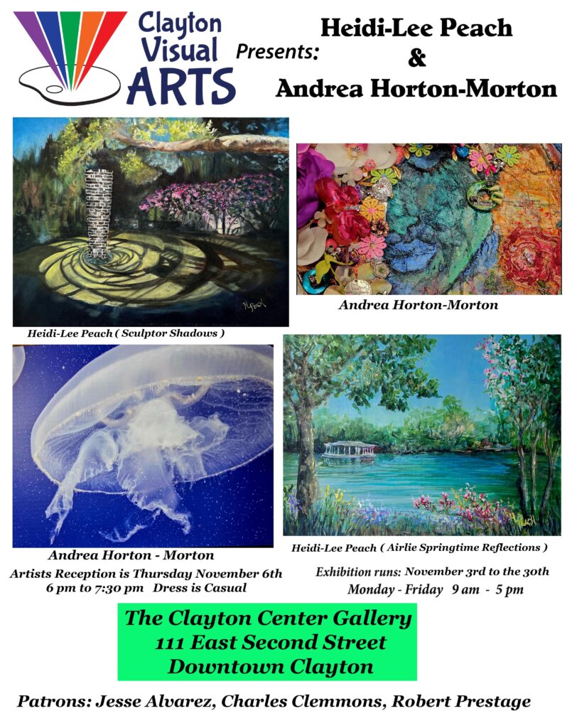 CVA hosts 2-dimensional original art exhibits throughout the year at The Clayton Center, the hub for the Town Hall, Public events and concerts for the town of Clayton. The gallery is open during regular business hours. The public is invited to the free artists reception which is held at the beginning of each month. Check the CALENDAR for exhibit schedule information.